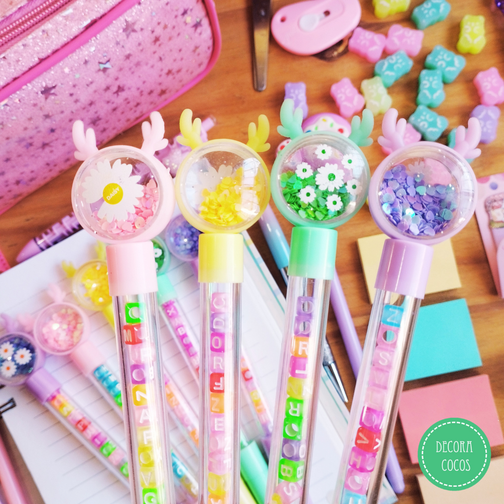 Bolígrafo Reno con capsula y brillos En su cuerpo dijes letritas y elástico para hacer tu pulserita Punta 0.7mm tinta azul Precio por unidad - Se envía surtido de colores