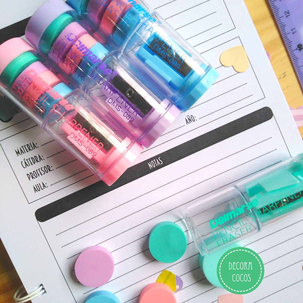 Sacapuntas + 4 gomitas Diseño en color celeste Precio por unidad - Se envía surtido de colores