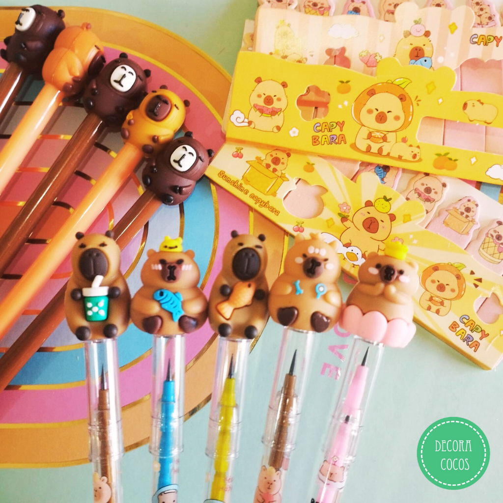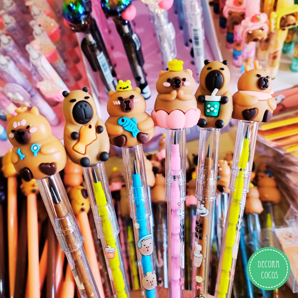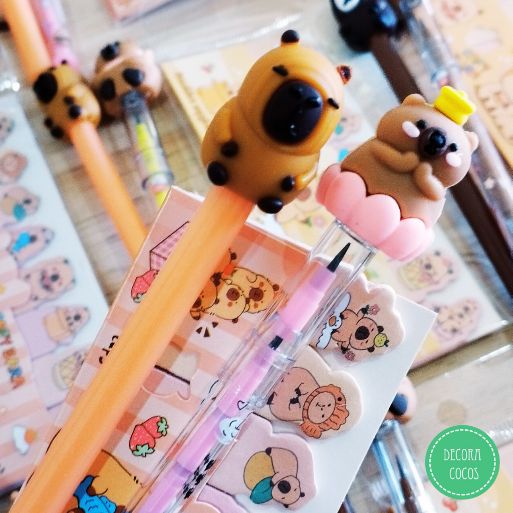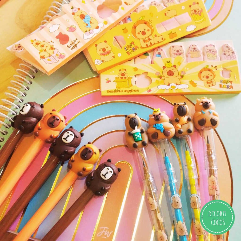 COMBO CAPIS 1 Lápiz con punta intercambiable Capibara + 1 Set de banderitas Capibara + 1 Bolígrafo Capibara (ideal para souvenir) Precio por combo - se envía surtido de colores