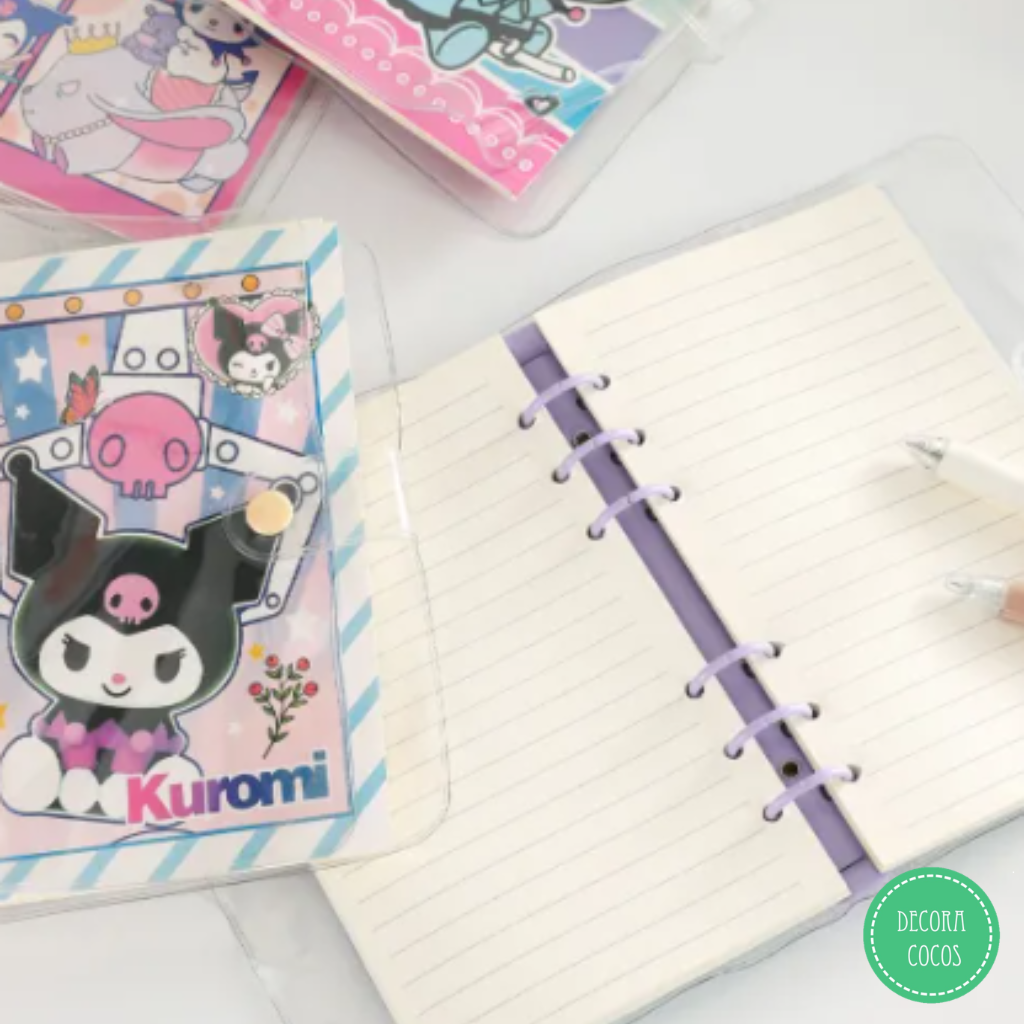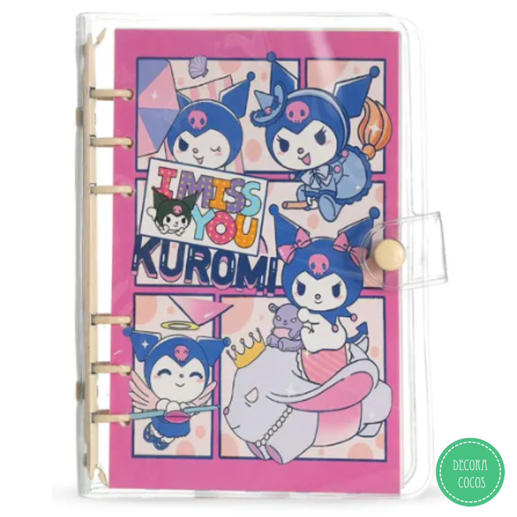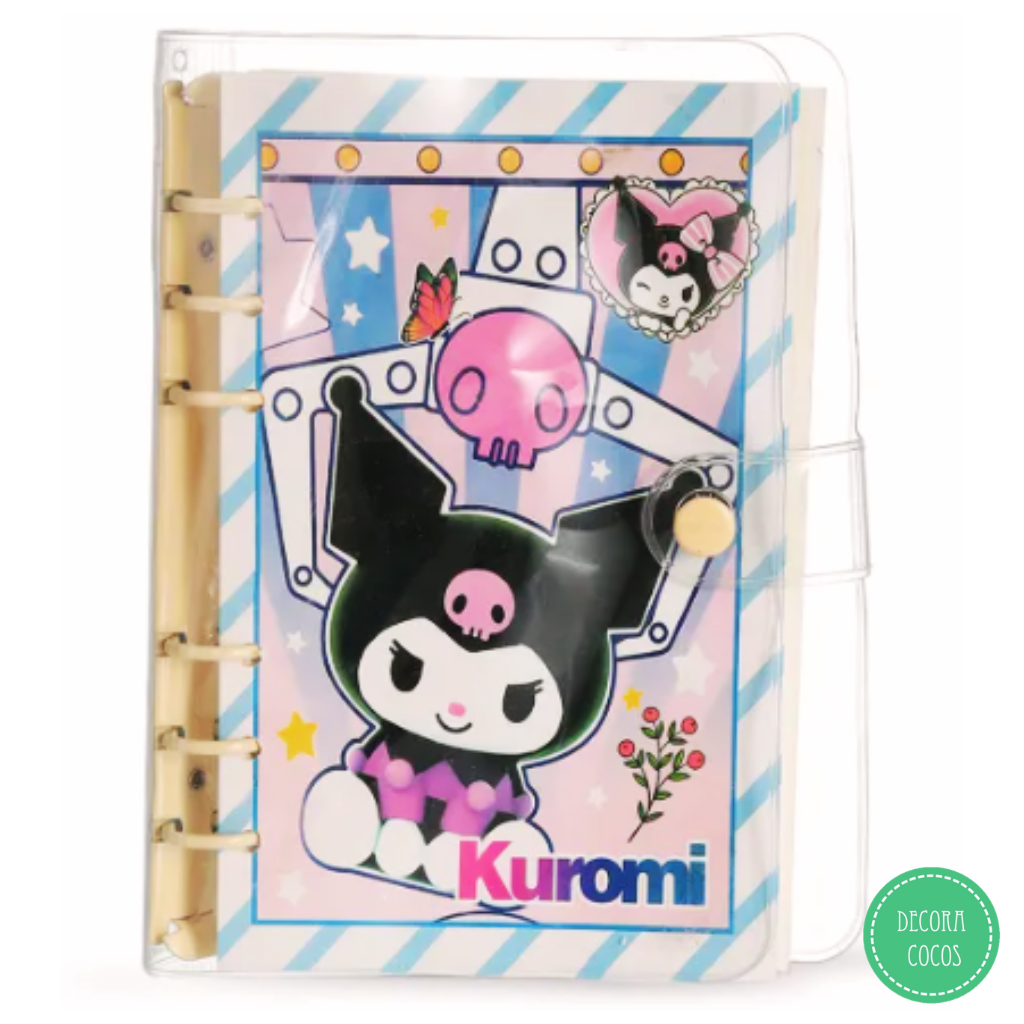 Cuaderno Kuromi con tapa plástica y cierre Tapa rígida plástica - Cierre con botón La base en sus extremos abre y cierra con botón metal a presión permitiendo sacar las hojas - agregarlas o intercambiarlas Medidas: 14 x 18 cm aprox Tapas de cartón de 300 gr - Impreso full color Precio por unidad - Se envía surtido según stock
