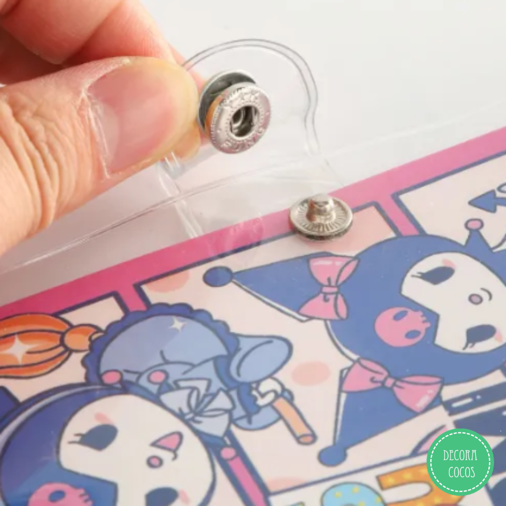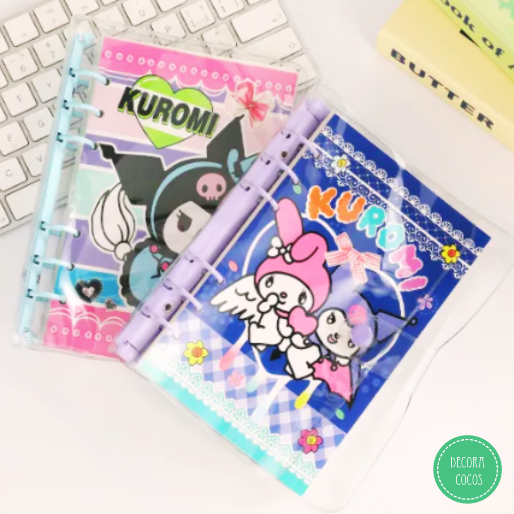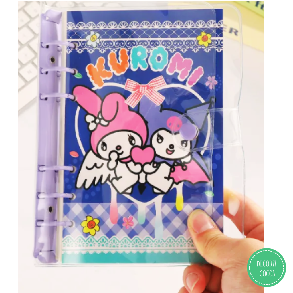Cuaderno Kuromi con tapa plástica y cierre Tapa rígida plástica - Cierre con botón La base en sus extremos abre y cierra con botón metal a presión permitiendo sacar las hojas - agregarlas o intercambiarlas Medidas: 14 x 18 cm aprox Tapas de cartón de 300 gr - Impreso full color Precio por unidad - Se envía surtido según stock